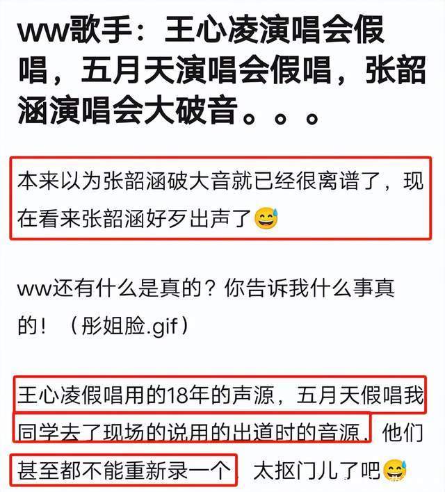 其实在五月天演唱会被质疑假唱之前,王心凌、张韶涵、梁静茹等东说念主皆因为演唱会破音跑调激励争议(顺说念一提,王心凌演唱会也曝出了假唱争议)。