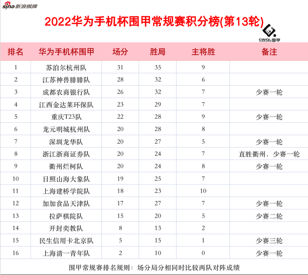 原定于前年12月初进行的围甲联赛因疫情原因展期,终于在新年头顺利开赛。22赛季围甲老例赛依然收场了13轮比拼(个别队伍有少赛情况),现在积分榜情况为卫冕冠军苏泊尔杭州队领跑,江苏神兽腓腓队、成皆农商银行队紧随后来,江西金达莱环保队、重庆T23队以微细场分差距列第四、第五。名纪律六至第十一位的队伍场分几近换取,季后赛争冠区限额仍有悬念。