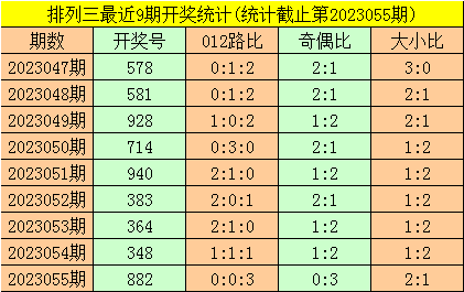一、胪列三第2023055期开出号码882,其奇偶比为0:3,大小比为2:1体育彩票排列三走势图,号码012路比为0:0:3。该号码直选历史上出现了6次。