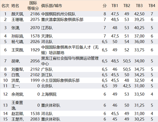 女子组中颜天琪表现出强大的实力,前九轮比赛7胜2和,而在第十轮的比赛又驯顺王珊珊,提前一轮将冠军收入囊中。